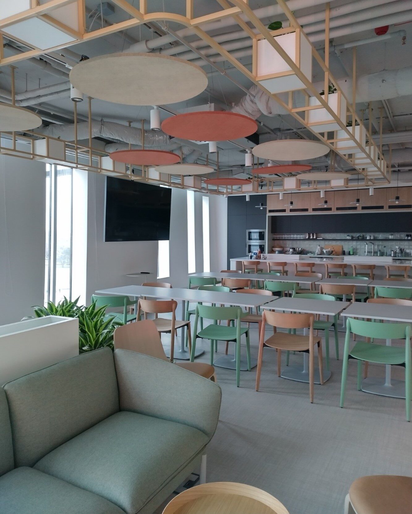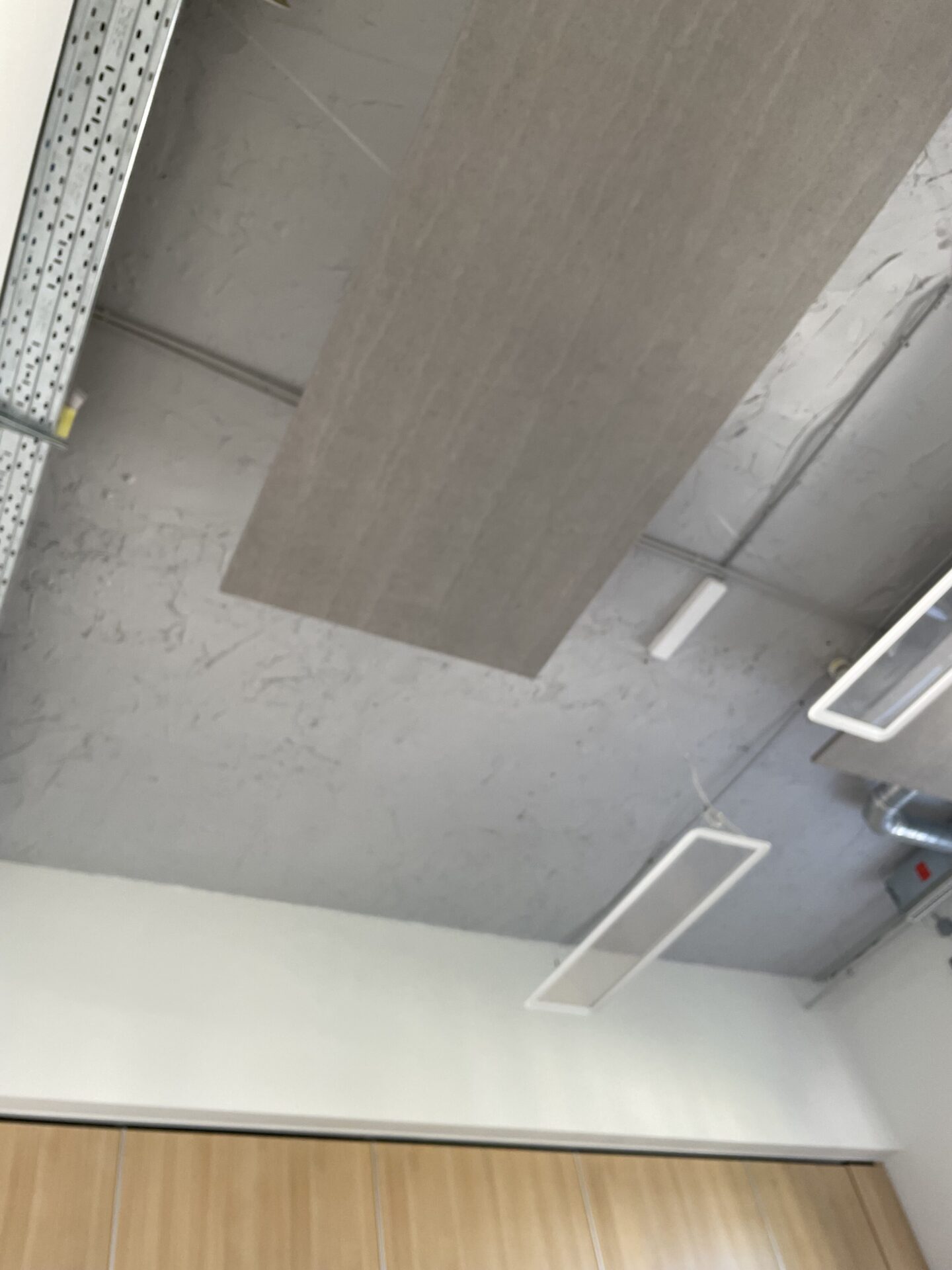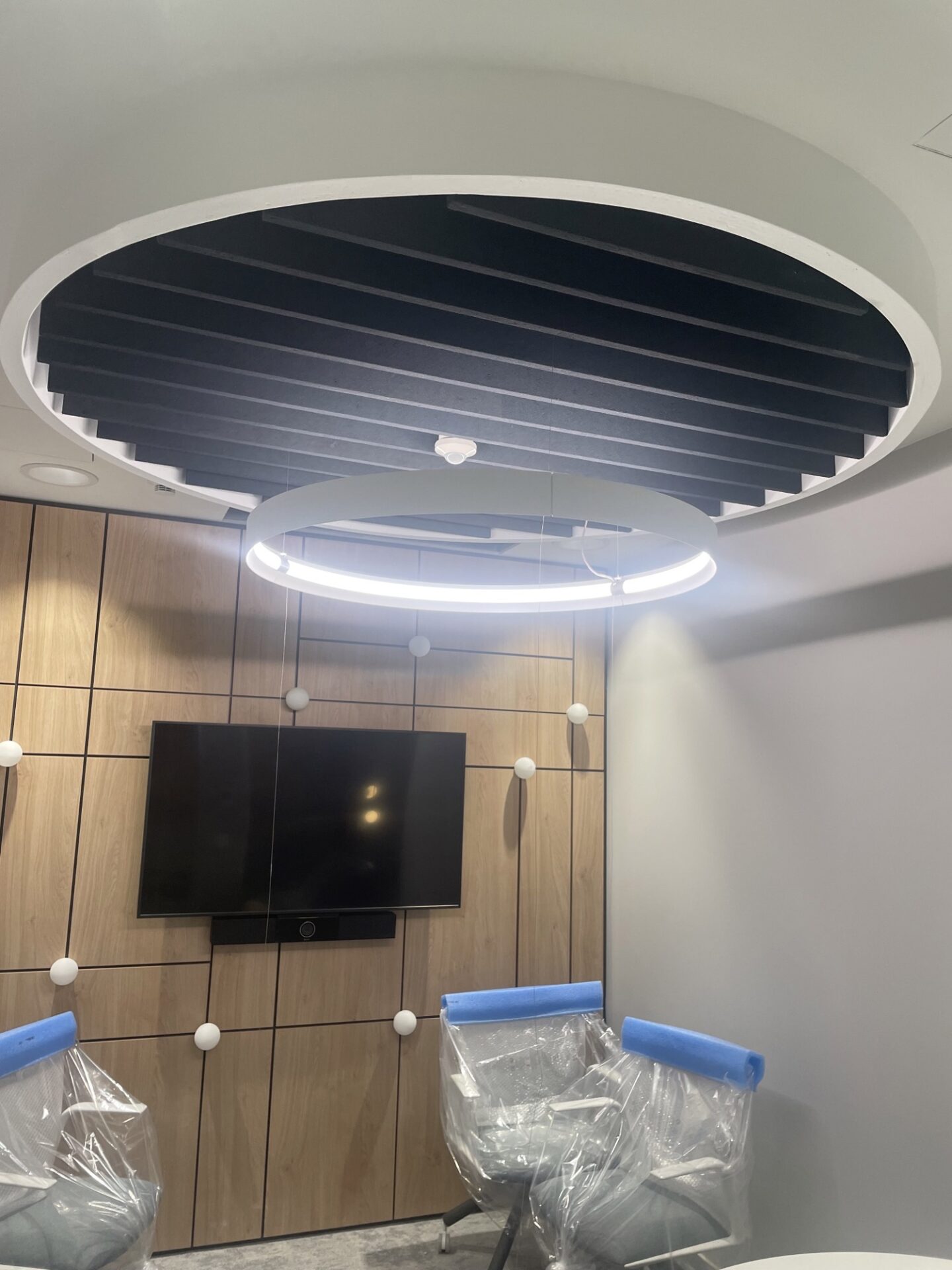 Egyedi megvalósítású finn tőzegből készült, festett mennyezeti akusztikai elemek.Kiváló akusztikai tulajdonsággal.